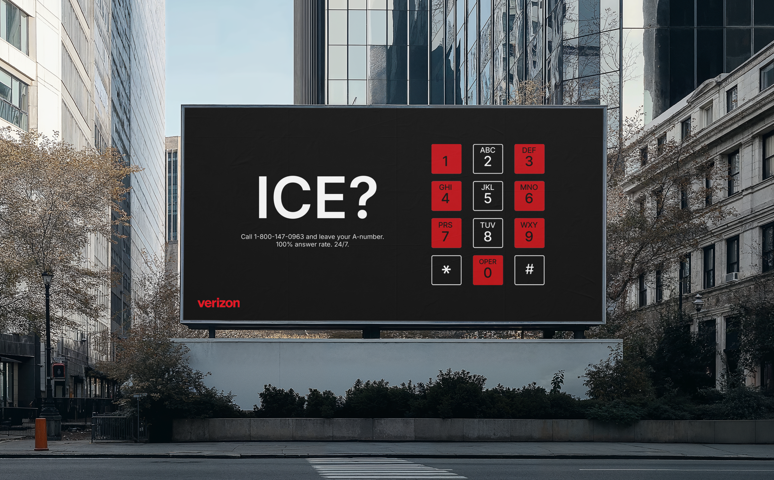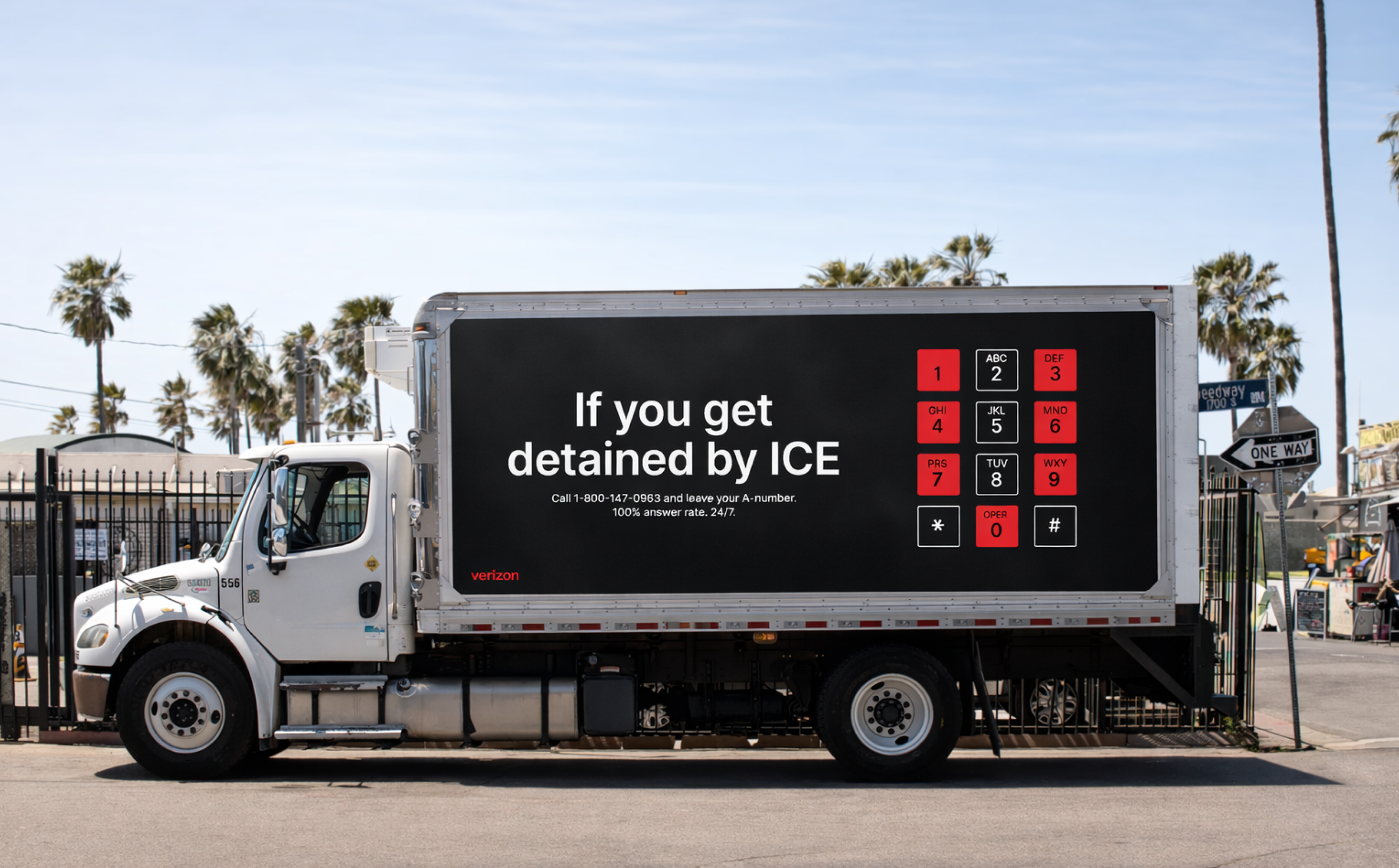 Multilingual support ensures every voice is understood. To make the number unforgettable, we’ve shaped it like the Verizon V. Trucks displaying the number will drive through areas surrounding detention centres and remain parked directly outside them, ensuring the lifeline is visible where it’s needed most. Connection only matters if it’s there when it counts most.